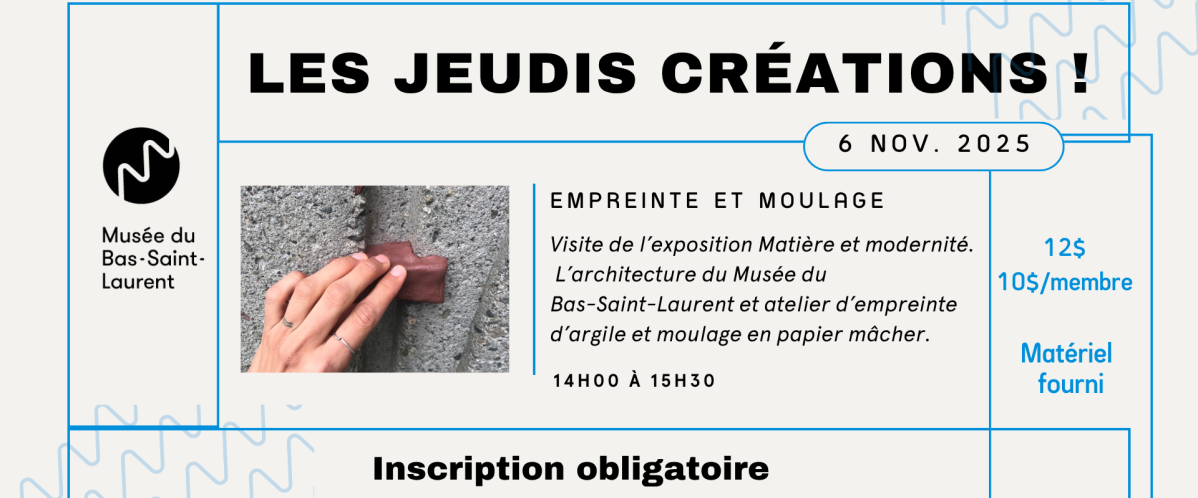 Le prochain jeudi création sera consacré à la découverte de l'exposition Matière et modernité. L'architecture du Musée du Bas-Saint-Laurent.