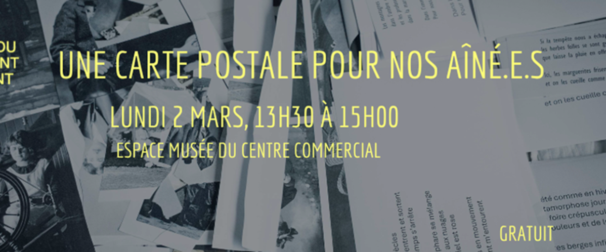 Rejoignez-nous à l'Espace Musée devant la Boutique du jouet au Centre commercial, et contribuez à répandre de la joie auprès des résident.e.s du CHSLD de Chauffailles grâce à l’écriture et la création de cartes postales en dessin et photo collage à partir de nos collections photos.